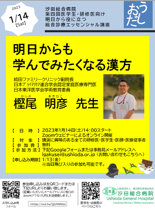【2023.1.14開催】第4回総合診療エッセンシャル講座(Web)のお知らせ カテゴリー:研修情報、講座情報 2023年1月14日(土)午後2時より総合診療エッセンシャル講座をZoomにて開催します。詳細につきましては案内チラシをご確認ください。講演に興味のある研修医、医学生、医師、医療従事者の方からのご参加をお待ちしております。【申込み方法】案内チラシの中のQRコードもしくは、研修医・医学生のページ→お問い合わせ→その他 からお申込みください。 お問い合わせ先:汐田総合病院 医局 研修担当 神戸